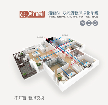 潔斐然新一代X6-AIR雙向流新風系統(tǒng)主機,適用于通風欠佳的樓宇辦公室、KTV、網(wǎng)吧及對空氣品質(zhì)有更高要求的別墅家居、幼兒園等場所。尤其是安裝有地暖的屋宇,通過新風主機動力將室外新鮮空氣引入室內(nèi),同時將室內(nèi)的污濁空氣排出室外。在系統(tǒng)運作時,新風與排風在熱能回收中心進行熱能交換,大幅度降低了室內(nèi)新風溫度處理的能耗。系統(tǒng)還配備先進的WiFi遠程物聯(lián)控制器,可實現(xiàn)遠程監(jiān)控管理。