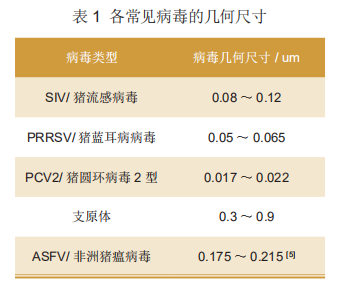 養(yǎng)殖業(yè)第一個空氣過濾系統(tǒng)誕生在20世紀(jì)90年代的法國布列塔尼公豬站,此后,在2005-2010年間,美國有41個養(yǎng)殖場建設(shè)空氣過濾系統(tǒng)。中國的養(yǎng)殖空氣過濾系統(tǒng)發(fā)軔于2008年前后,同樣也是首先應(yīng)用于公豬站,均采用物理過濾法過濾相應(yīng)粒徑的病毒,各常見病毒的幾何尺寸如表1所示。