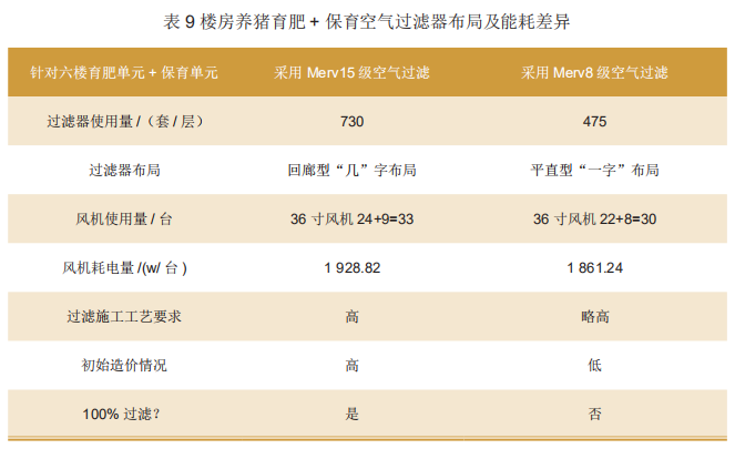 部分養(yǎng)殖企業(yè)在實(shí)際使用中,形成了具有各自偏好的豬舍結(jié)構(gòu)和布局方式,通風(fēng)模式也有區(qū)別,比如:金新農(nóng)鐵力公豬站采用負(fù)壓垂直通風(fēng)、上海祥欣種公豬育種中心采用水平負(fù)壓通風(fēng)、天兆武勝公豬站采用有的余氏通風(fēng)模式。在空氣過濾系統(tǒng)規(guī)劃設(shè)計(jì)中可以根據(jù)各場舍的不同特點(diǎn),充分考慮工況和能耗,來調(diào)整過濾方案,不同的空氣過濾系統(tǒng)設(shè)計(jì)思路所帶來的過濾效果和運(yùn)用能耗、維護(hù)費(fèi)用是完全不同的。以樓房養(yǎng)豬育肥+保育混合同層為例來看,如表9所示。