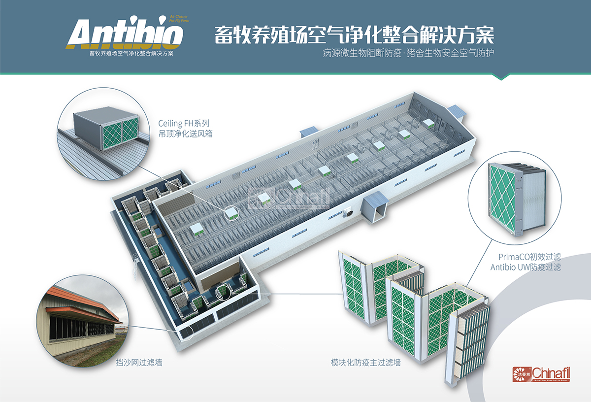 作為一家以生物安全空氣防疫和規(guī)模疫情控制為重點(diǎn)研究的企業(yè),作為空氣過濾國家標(biāo)準(zhǔn)的編寫單位,潔斐然,自主研發(fā)了“整體空氣防疫系統(tǒng)——AntiBio”(養(yǎng)豬場空氣過濾系統(tǒng)),系統(tǒng)包括:空氣過濾現(xiàn)場勘察評估、量身定制化過濾設(shè)計(jì)、全系統(tǒng)性能匹配、整包管理施工和建后測試驗(yàn)證五個(gè)板塊,其中定制化過濾設(shè)計(jì)蘊(yùn)含了從材料研發(fā)到空氣流體模型優(yōu)化、以及制造裝備等方面的新技術(shù),并獲得多項(xiàng)專利和知識產(chǎn)權(quán)。在這套系統(tǒng)的保護(hù)之下,豬舍猶如裝備了護(hù)衛(wèi)盾的宇宙飛船,大到蚊蟲鼠鳥,小到納米級的細(xì)菌、病毒、微生物,都再也無法經(jīng)風(fēng)道進(jìn)入豬舍內(nèi)部,豬的生長環(huán)境變得更加安全、舒適。