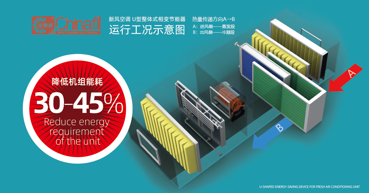 潔斐然新風(fēng)空調(diào)專(zhuān)用U型節(jié)能器,它采用相變傳熱技術(shù),通過(guò)兩組換熱器分別位于表冷前后,在熱季實(shí)現(xiàn)高效的熱量傳遞和節(jié)能效果?。以10000CMH新風(fēng)空調(diào)為例,熱季節(jié)能效果:當(dāng)新風(fēng)空調(diào)為電再熱形式時(shí),一個(gè)完整熱季約可省電50000元;當(dāng)新風(fēng)空調(diào)再熱盤(pán)管熱源為燃?xì)獾臅r(shí)候,一個(gè)完整熱季約可省電40000元;當(dāng)新風(fēng)空調(diào)使用蒸汽再熱時(shí)候,一個(gè)完整熱季約可省電30000元。