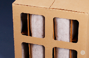 油霧紙盒過濾器,外殼選用高強度硬紙板制作,能滿足搬運和工況的需要;箱體內(nèi)部由兩段組成,分別是油霧捕集段和終過濾段;油霧捕集段的作用是捕集絕大部分的油霧,終過濾段是用來攔截剩余的微量油霧;油霧捕集單元由紙板框架和細切網(wǎng)狀的牛皮纖維紙材料組成,網(wǎng)狀的牛皮纖維紙多層交疊,保障通風量的同時,氣流通道細密繁多,而且復雜無規(guī)律,油霧粒子隨氣流與紙濾網(wǎng)發(fā)生碰撞,便于油霧的捕集附著,基于紙盒油霧過濾器有的結(jié)構(gòu)設(shè)計,油霧捕集量是同類產(chǎn)品的一倍以上。